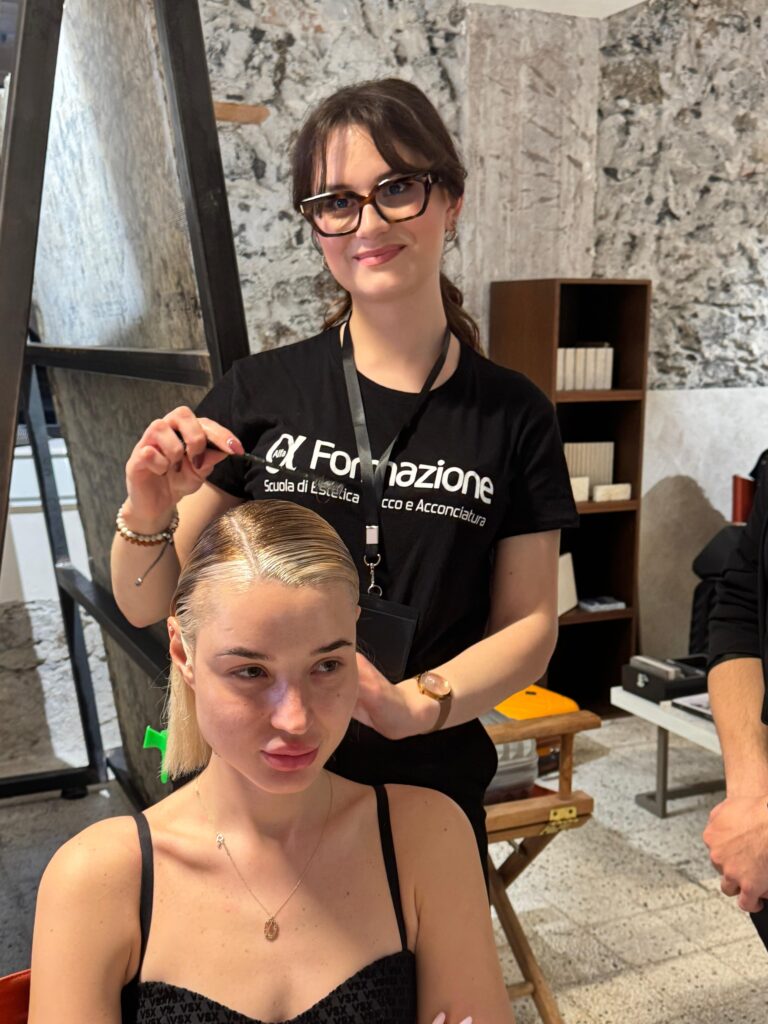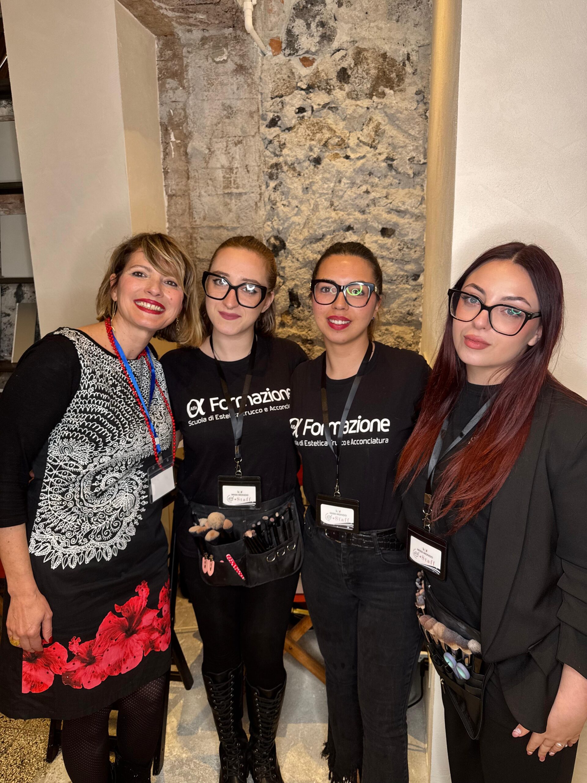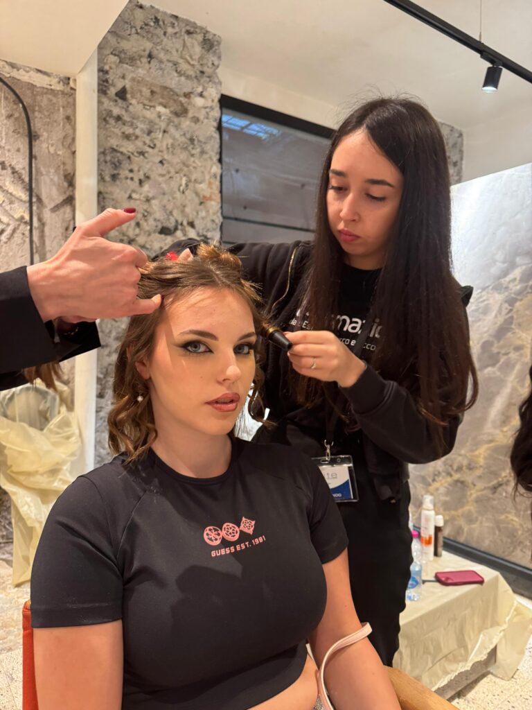 Il backstage, coordinato presso Tito D’Emilio, ha rappresentato un’occasione concreta di formazione sul campo. Le nostre studentesse e i nostri studenti, provenienti dalle sedi di estetica di Catania e Caltagirone e dalla scuola parrucchieri, hanno lavorato come veri professionisti occupandosi di: